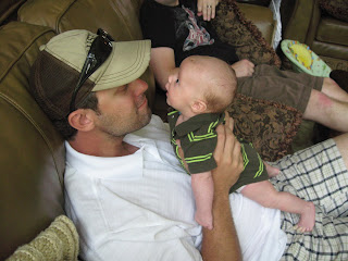 My oh My - it has been way too long since I'm written anything on this blog. I am not doing a very good job of keeping everyone updated. Jax will be 7 weeks tomorrow and I just cannot believe its been that long already. He is growing so fast and becoming such a strong little man. He holds his head up so well and likes to push himself off the floor. He has started smiling and talking and it is just the cutest thing in the world. My heart melts everytime a little sound comes out of his mouth. Our little guy is a FABULOUS sleeper. He usually goes between 7 and 8 hours at night which is amazing. We get plenty of sleep, at least for now. I hope this doesn't change as he gets older. Here are some pics of him from the last couple of weeks. He's been visiting with his cousins who are here from out of town and Uncle Eric also came to play.
